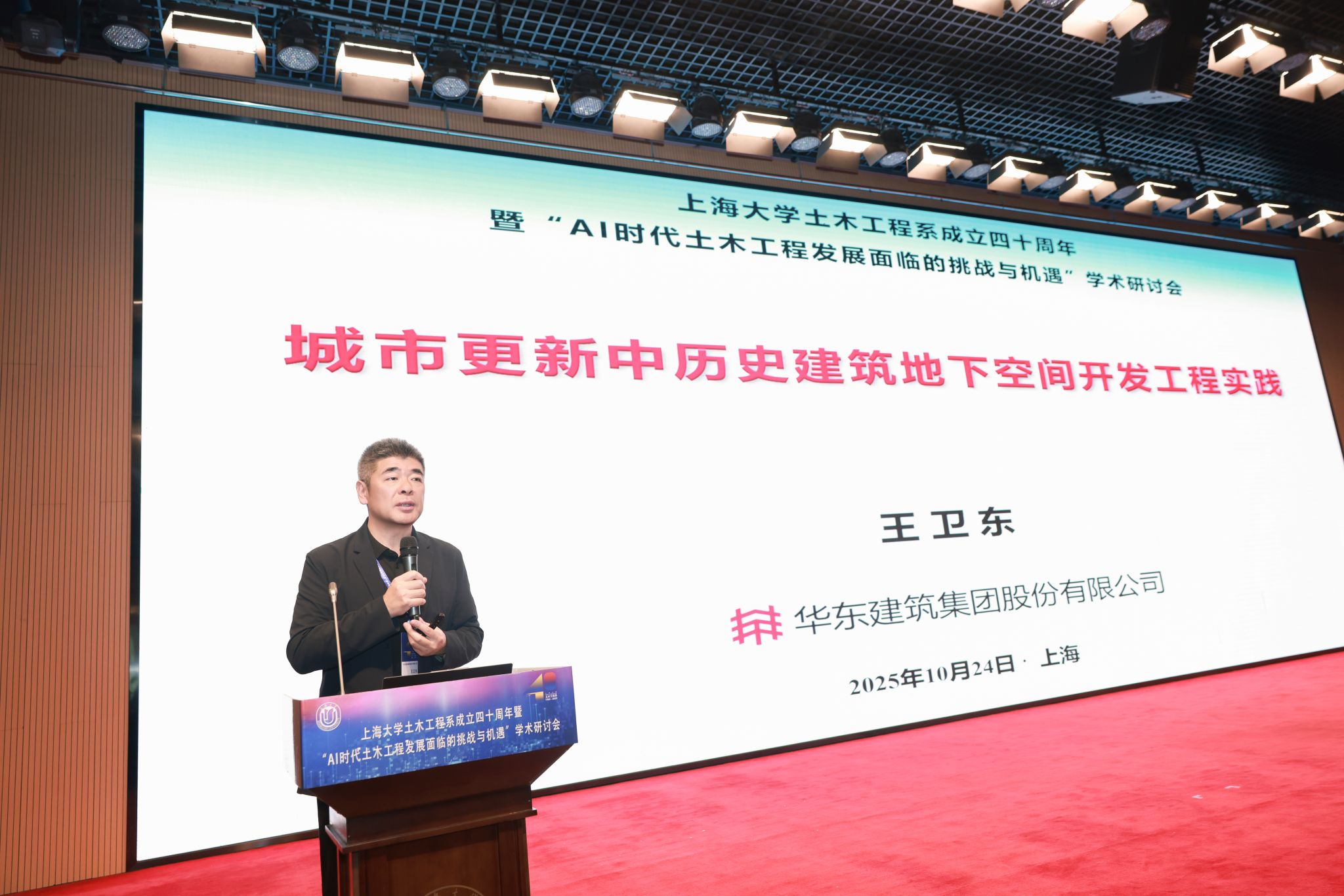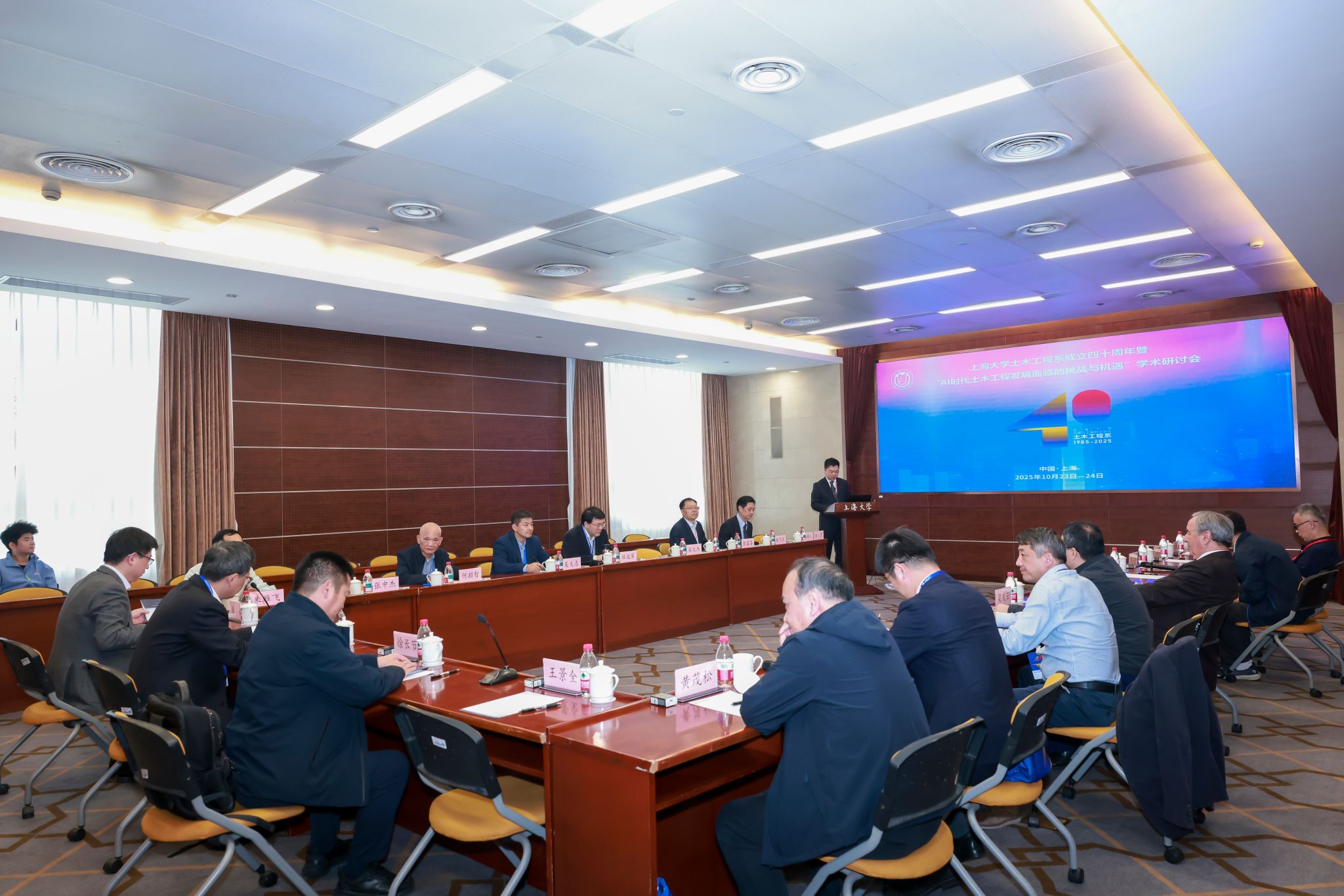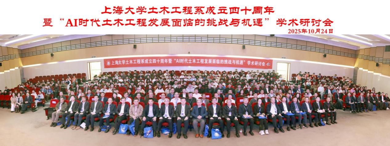 10月24日,上海大学力学与工程科学学院土木工程系成立40周年暨“AI时代土木工程发展面临的挑战与机遇”学术研讨会在宝山校区召开。中国科学院院士、重庆交通大学校长赖远明,中国科学院院士、同济大学教授李杰,中国土木工程学会副理事长、同济大学原副校长顾祥林,浙江工业大学党委书记蔡袁强,华东交通大学校长徐长节,上海应用技术大学原党委书记刘宇陆,江苏大学副校长王景全,上海大学原副校长叶志明,全国工程勘察设计大师、华东建筑集团股份有限公司总工程师王卫东,上海建工集团股份有限公司总工程师陈晓明,上海隧道工程股份有限公司总工程师朱雁飞,上海市土木工程学会、上海市地质学会、国内相关高校、科研院所和企业专家学者,校党委副书记、副校长胡大伟,校内有关部处、学院负责人和力工学院师生代表出席大会。