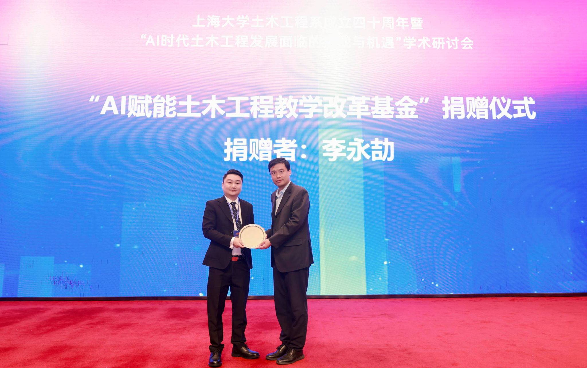 李永劼先生个人捐赠人民币两百万元,成立“AI赋能土木工程教学改革基金”。上海大学党委副书记、副校长胡大伟向李永劼先生颁发捐赠纪念牌。李永劼表示,人工智能与传统土木工程的深度融合,是未来工程领域发展的必然趋势。他希望该基金能助力土木工程系在AI+土木工程领域培养更多优秀的工程人才,为推动行业进步贡献力量。