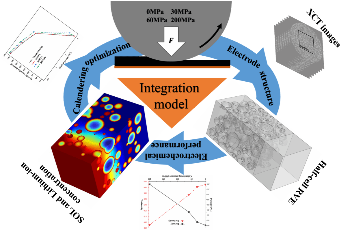辊压是锂离子电池电极制造过程中的关键工序,其压力参数直接影响电极的三维微观结构,进而决定电池的容量、倍率性能和循环稳定性。为建立“工艺—结构—性能”之间的定量关联,研究团队创新性地基于不同辊压压力下的X射线CT扫描图像,重建了NMC111阴极的三维微观结构,并构建了四个能够分辨微观特征的半电池模型,开展三维电化学数值模拟。模拟结果与实验测得的放电曲线高度一致,验证了模型的有效性。